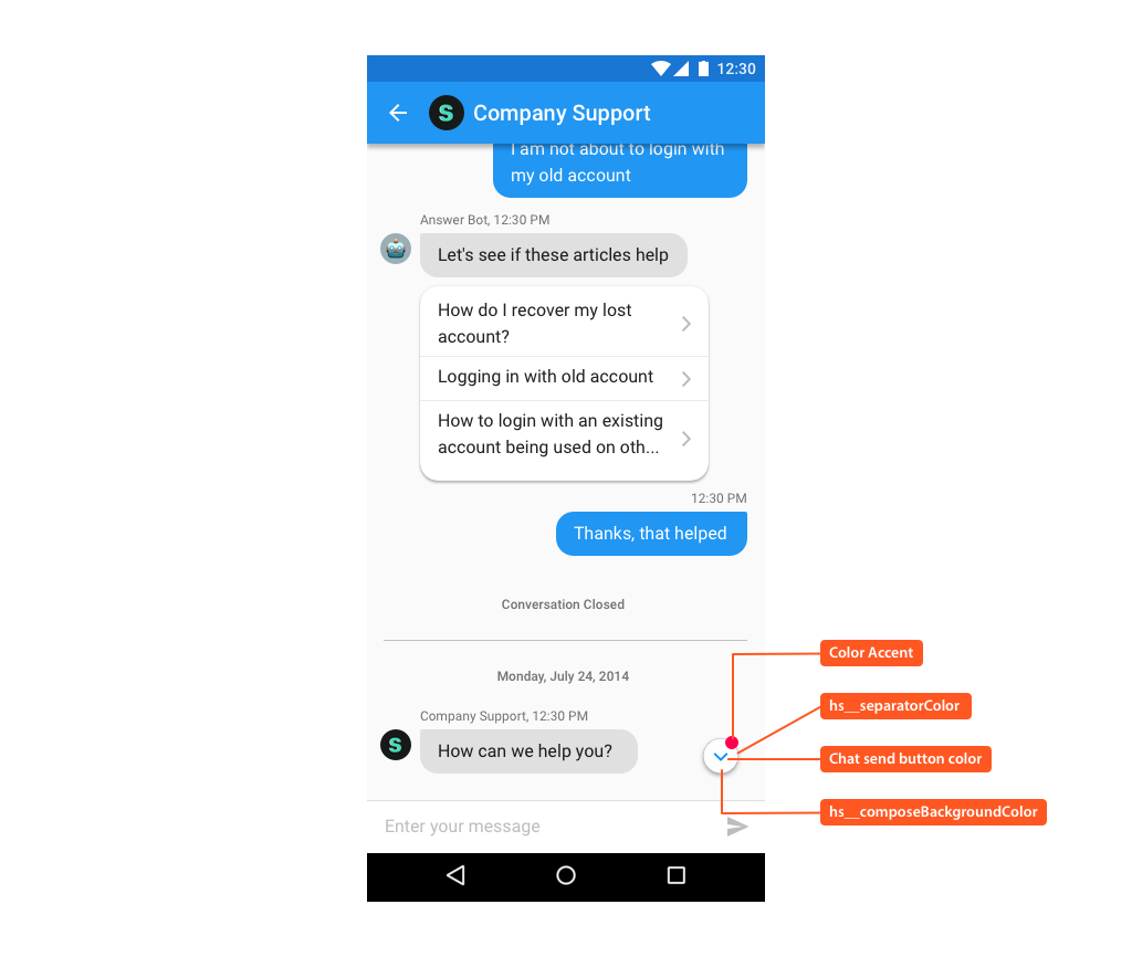 | hs__composeBackgroundColor | Color of the active send button on conversation screen. Background color of the jump to latest message button. |