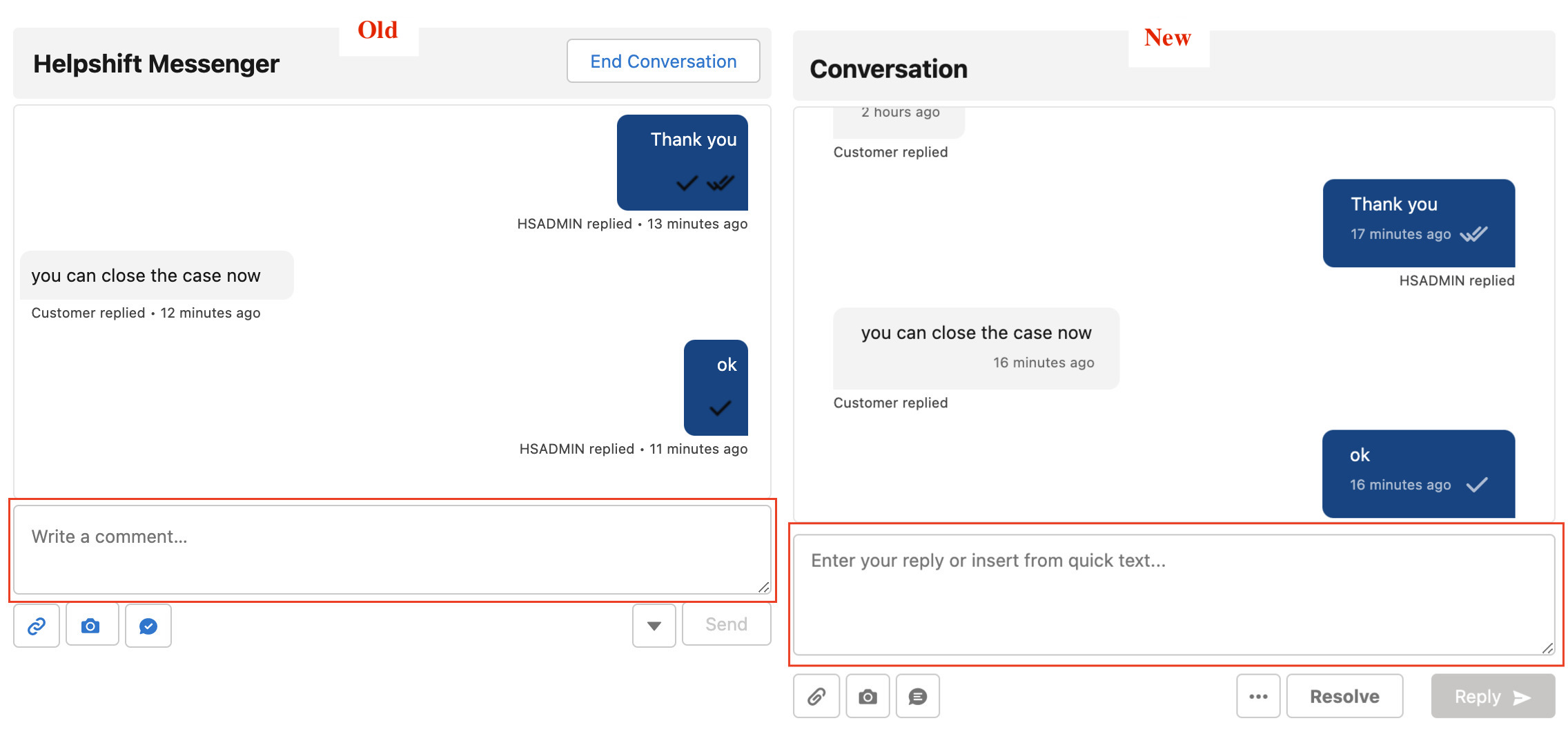 - The old experience will be available too. If the new messenger or any admin functionality doesn’t work as per your expectations, or you do not like the new experience, you can switch back to the old experience. Please provide feedback to Helpshift Support on reasons to switch back.