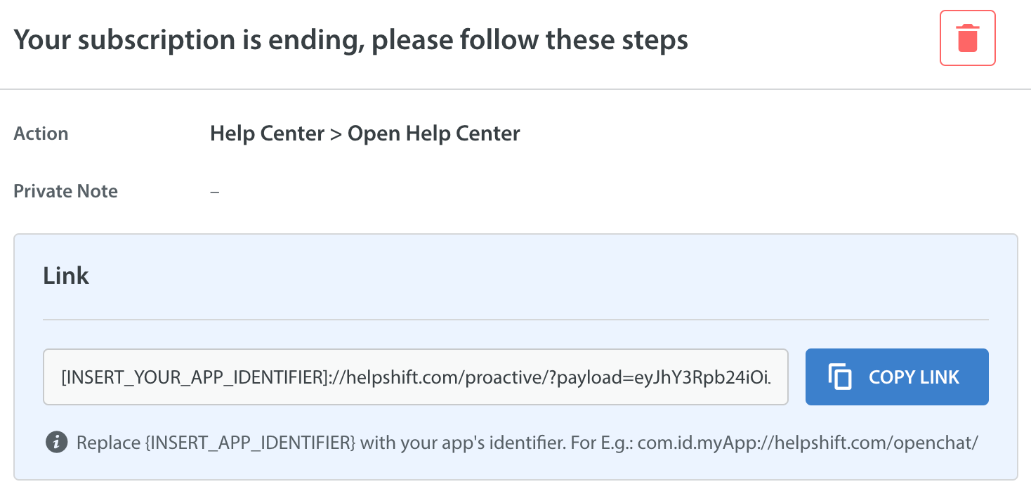 2. In your app, handle this notification such that when a user opens the app through the notification, you read the notification payload and pass this proactive link (as a simple string) to Helpshift SDK via handleProactiveLink(<PROACTIVE_LINK>,<LOCAL_API_CONFIG>) function.