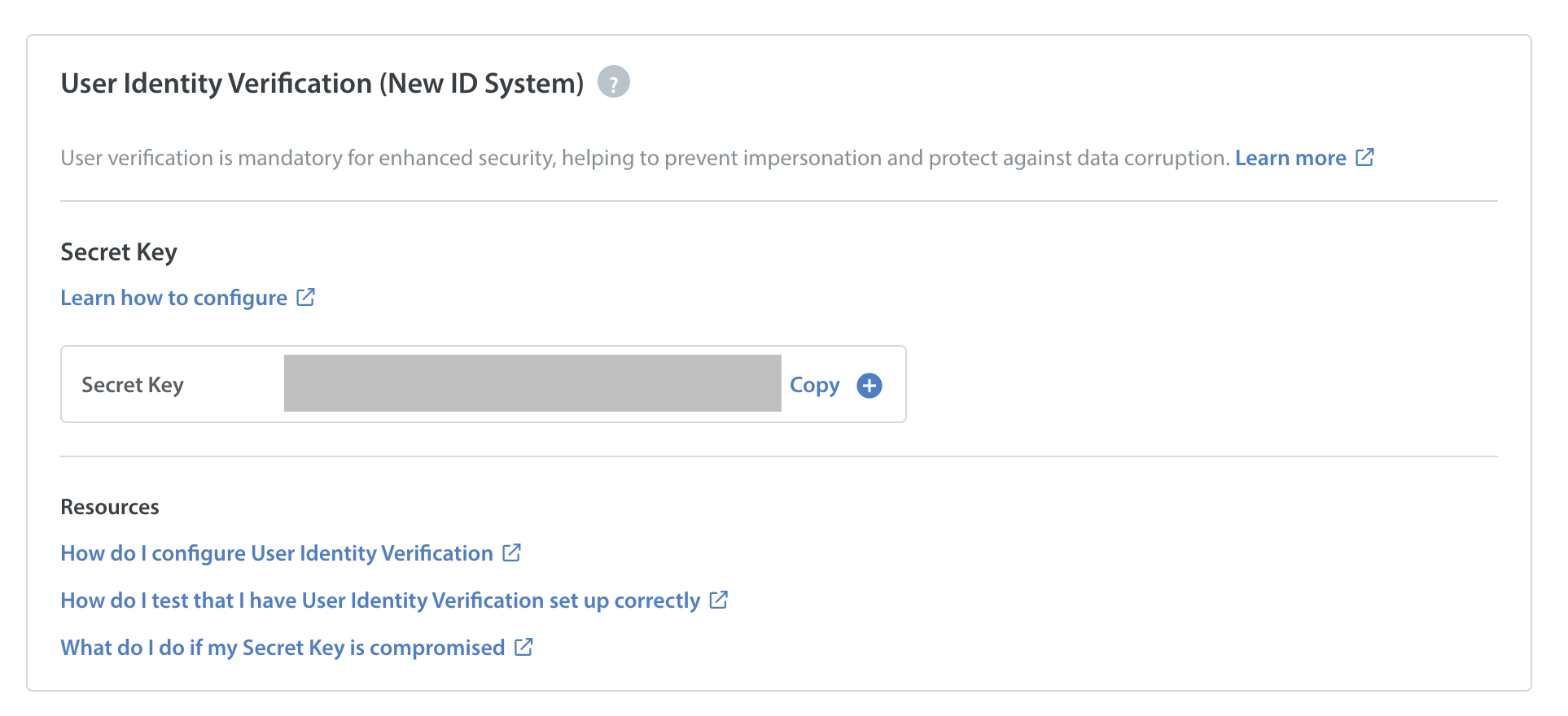 • Ensure that you have the secret key from Helpshift Dashboard. The secret key can be generated from the “User Identity Verification (New ID System)” section of your app’s settings.